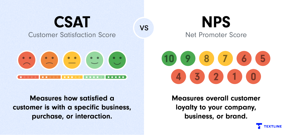 The main difference between a CSAT and NPS survey is that CSAT surveys are a short-term indicator of customer satisfaction. In contrast, NPS surveys are a long-term indicator of customer loyalty and how likely customers are to recommend your business to friends and colleagues.