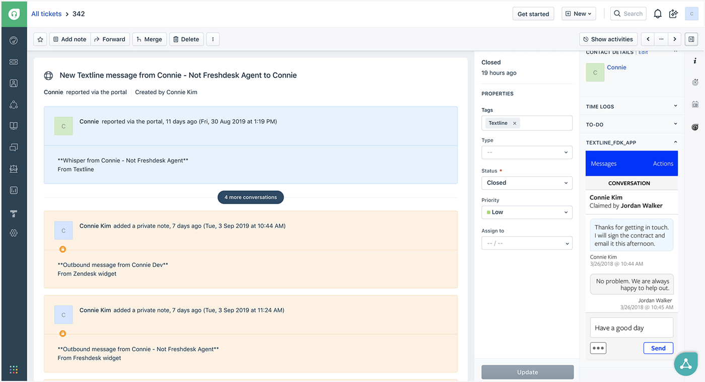 Send and respond to text messages right from Freshdesk, rather than switching back and forth between different platforms when you need to quickly respond to a customer support issue or view a record of all of your conversations. All text conversations are automatically logged on customer tickets, while Freshdesk contacts are saved in Textline’s address book.